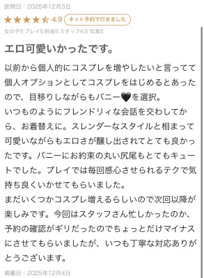 口コミお礼💌 2025/12/10 13:40:53 素敵な口コミありがとう😭🫶うるの個人オプションコスプレ一番目✨前回案出し合ってななこも増えちゃった😂毎回ほめてくれる瞬間あるから嬉しい🥺思い出たっくさん増えてくね😉これからもなかよくしてねっ🥺💖
